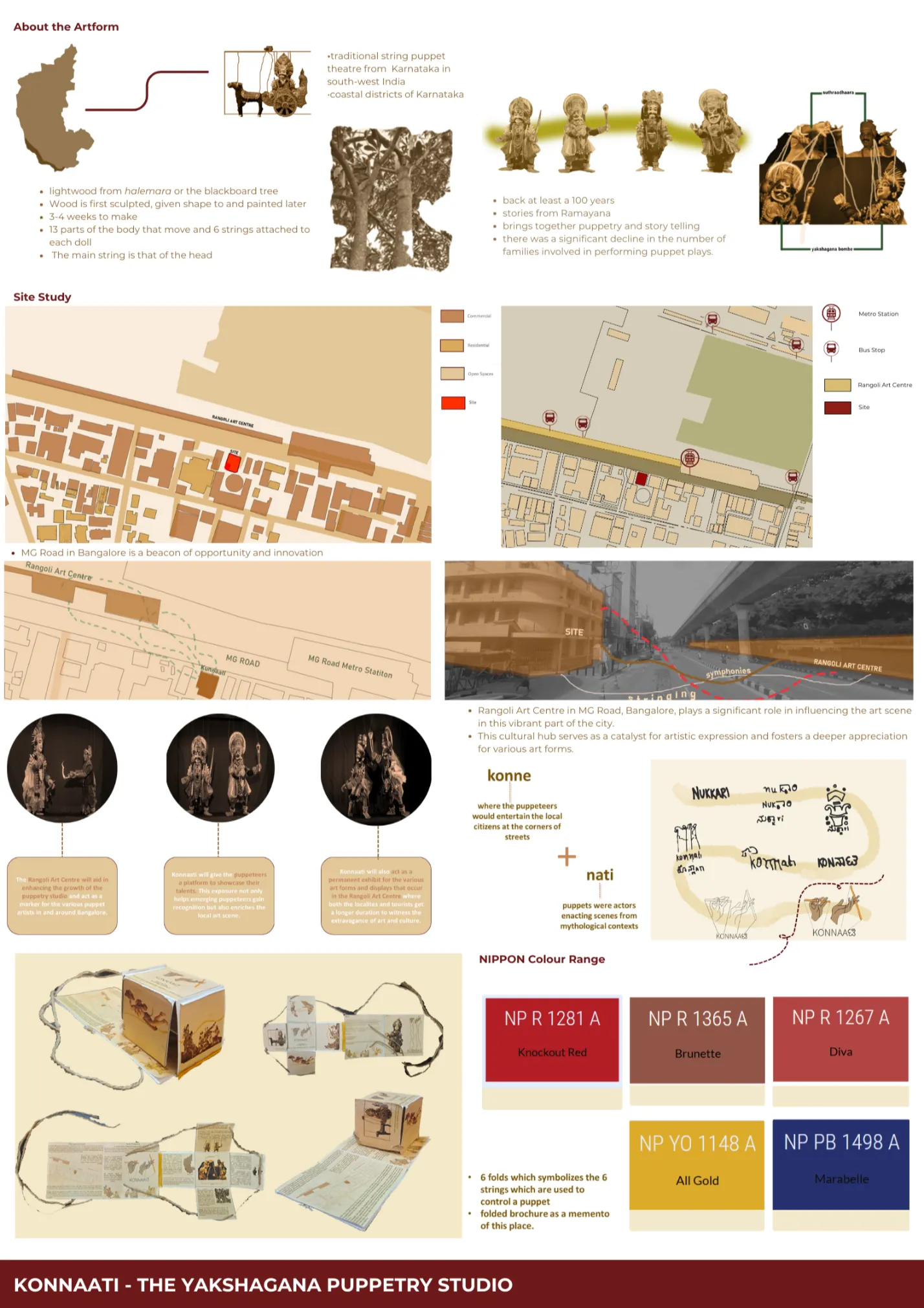 Konnaati is a cultural intervention that bridges tradition and innovation through architecture, storytelling, and sustainability. Located on MG Road, Bengaluru—an epicenter of creativity and connectivity—the project reimagines an urban void into a vibrant platform celebrating the dying art of Yakshagana Gombeyaata, Karnataka’s traditional puppetry.