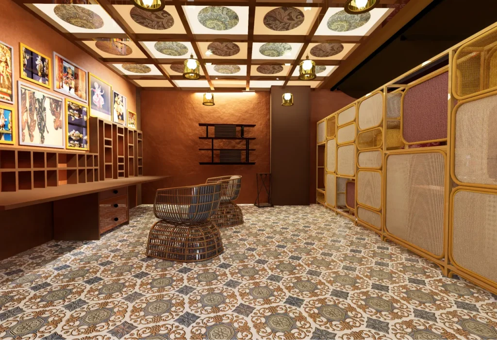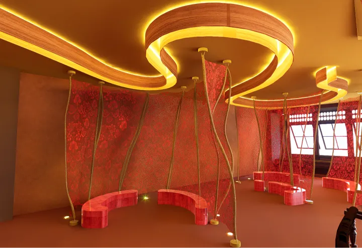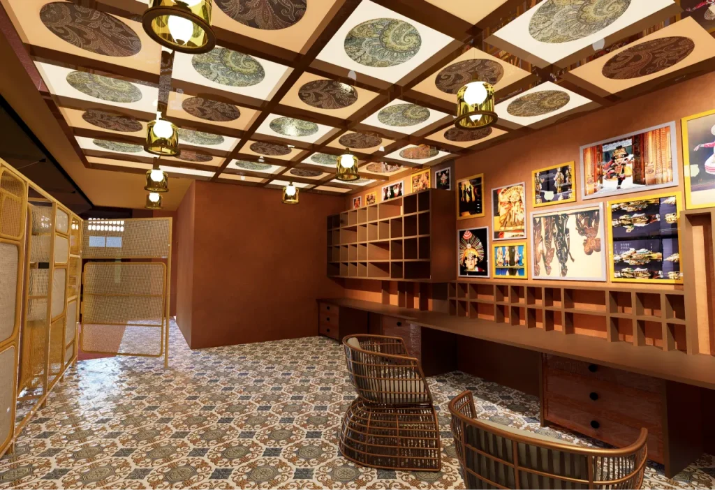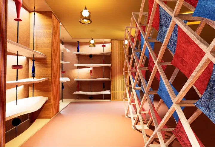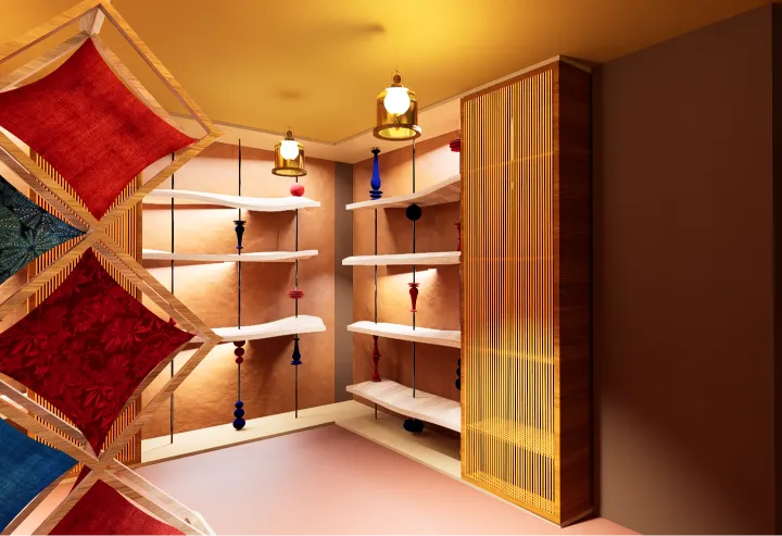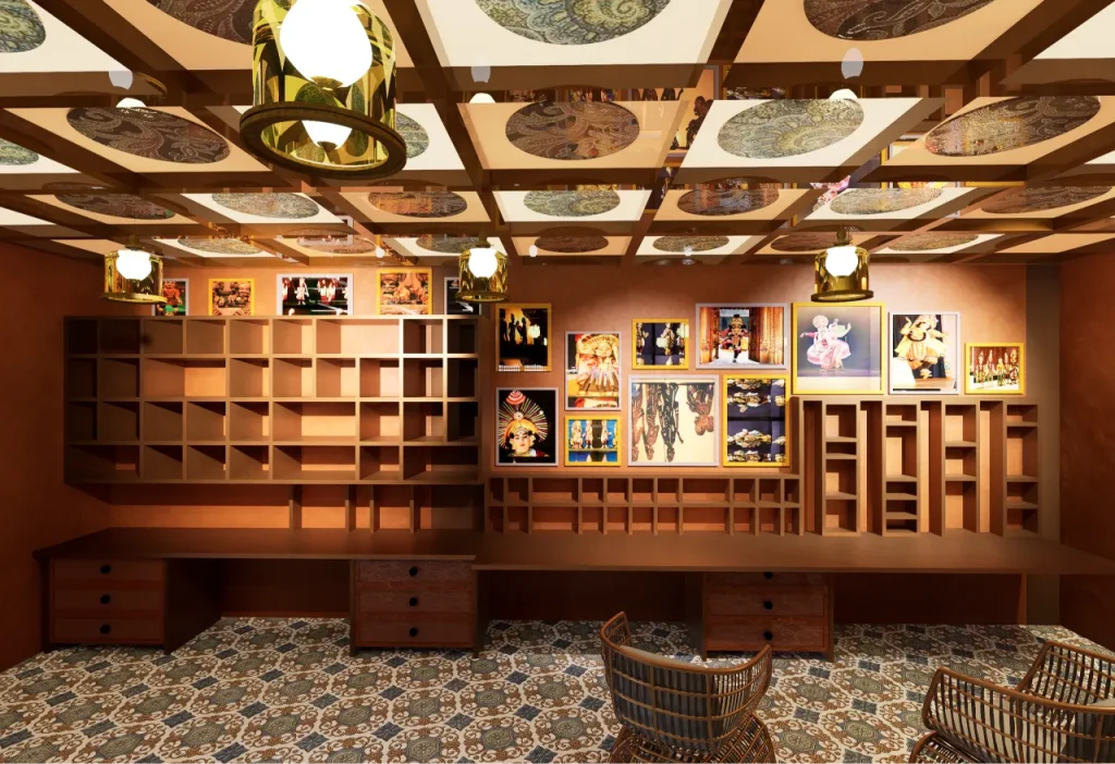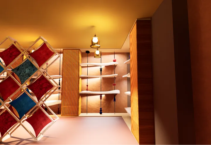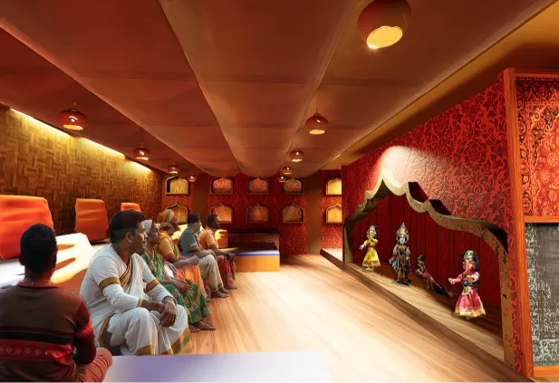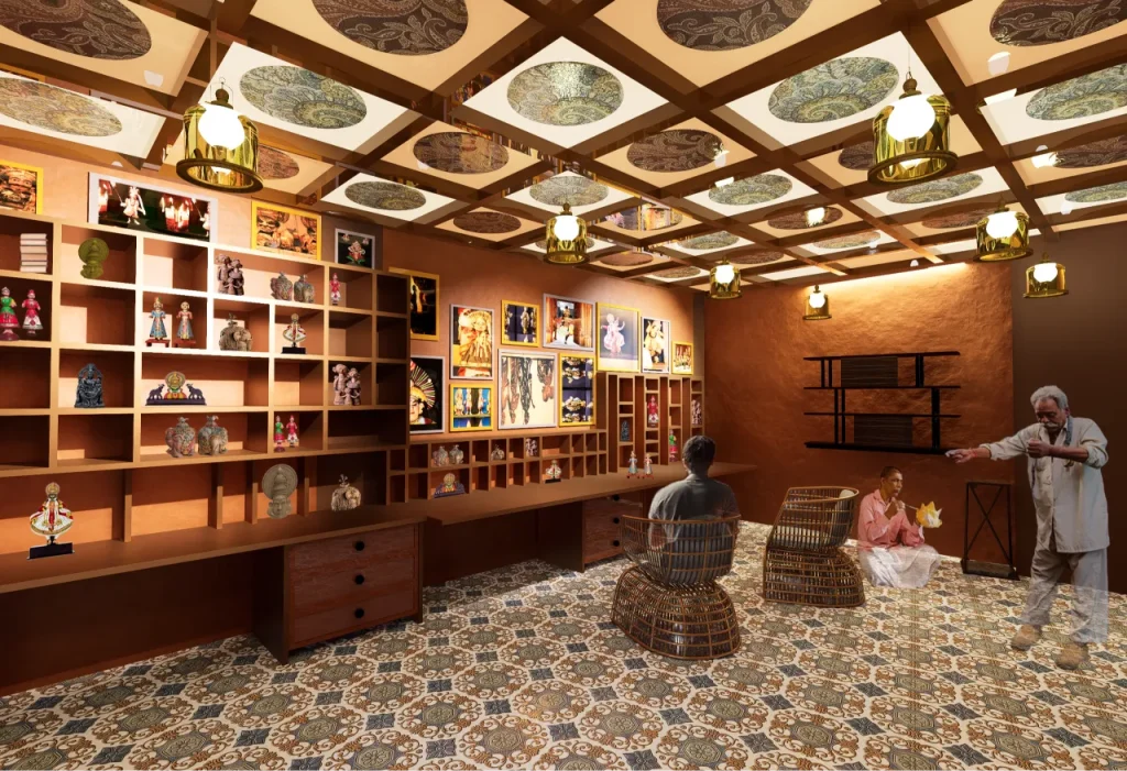 Programmatically, the ground floor includes the reception and waiting areas, leading to a gallery and performance space. Red oxide flooring and reclaimed furniture establish a sense of warmth and rootedness. The upper levels house puppet exhibitions, souvenir spaces, workshops, and puppeteer workspaces. Lighting strategies—such as recessed ceiling lights and coconut shell pendants—enhance mood and wayfinding, especially within fabric-draped enclosures that reveal and conceal the puppets as visitors move.