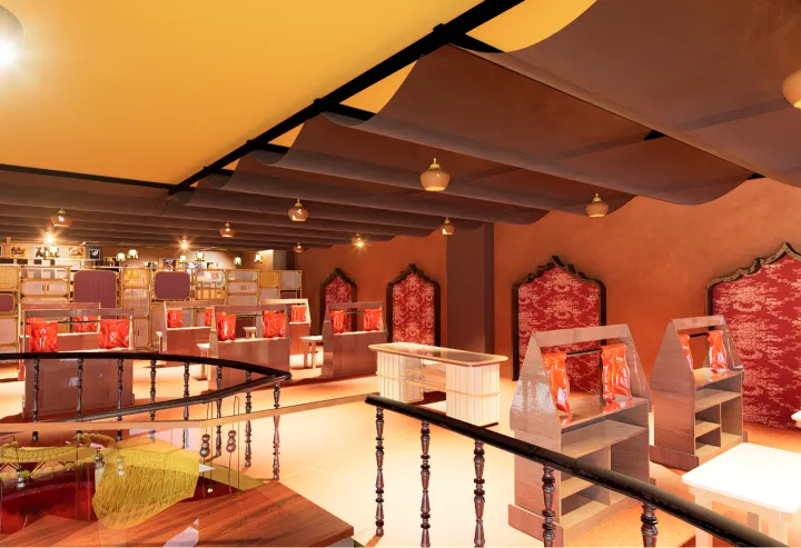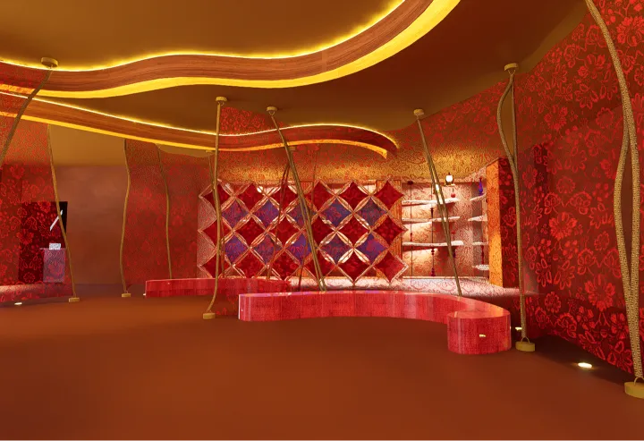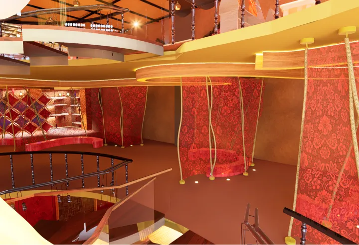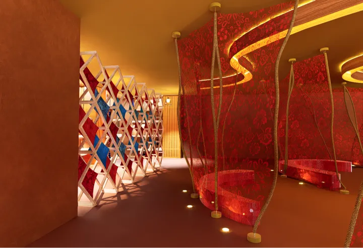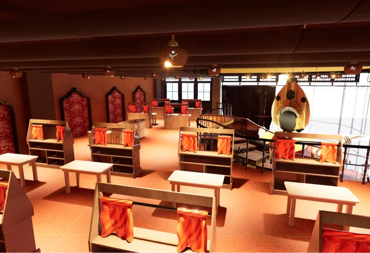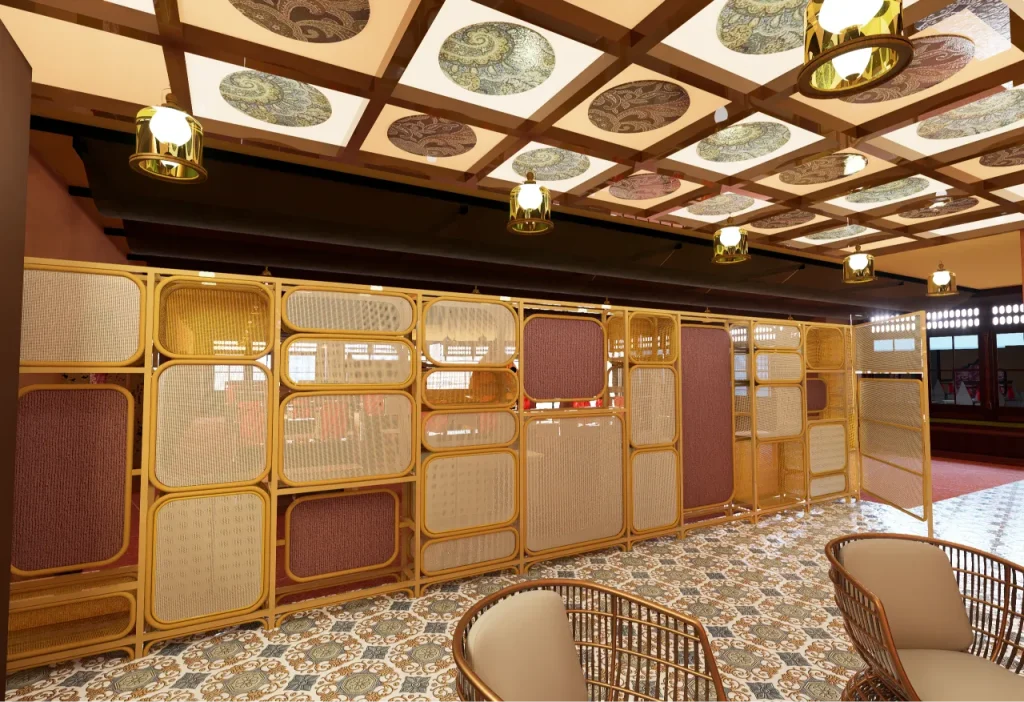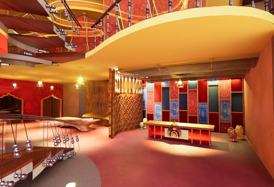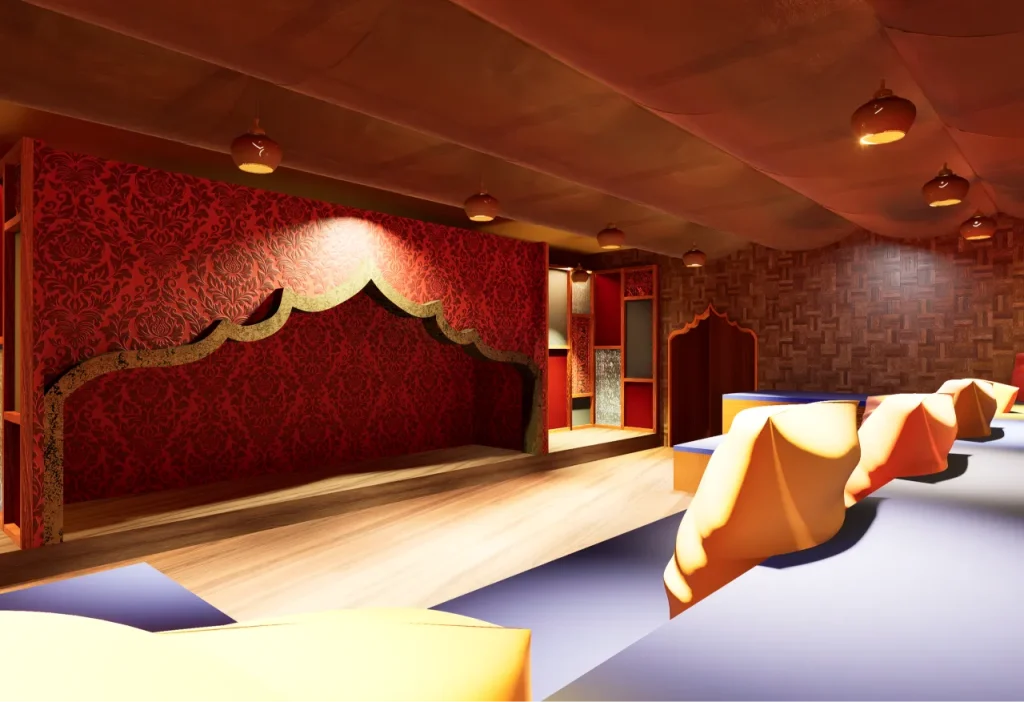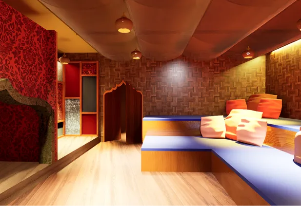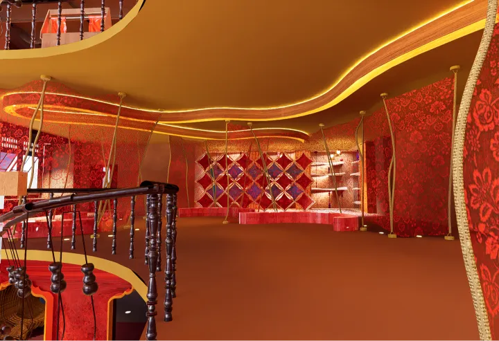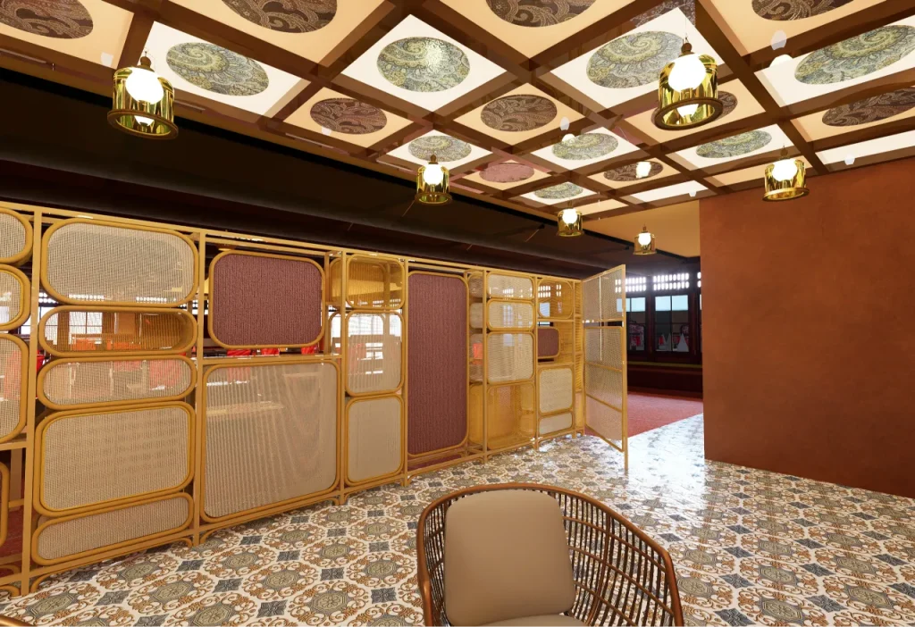 Programmatically, the ground floor includes the reception and waiting areas, leading to a gallery and performance space. Red oxide flooring and reclaimed furniture establish a sense of warmth and rootedness. The upper levels house puppet exhibitions, souvenir spaces, workshops, and puppeteer workspaces. Lighting strategies—such as recessed ceiling lights and coconut shell pendants—enhance mood and wayfinding, especially within fabric-draped enclosures that reveal and conceal the puppets as visitors move.
