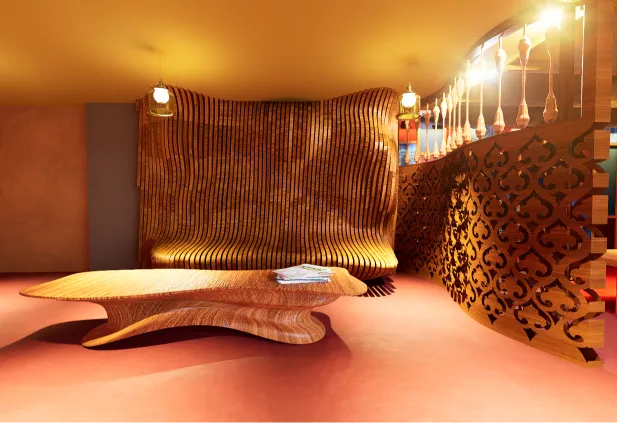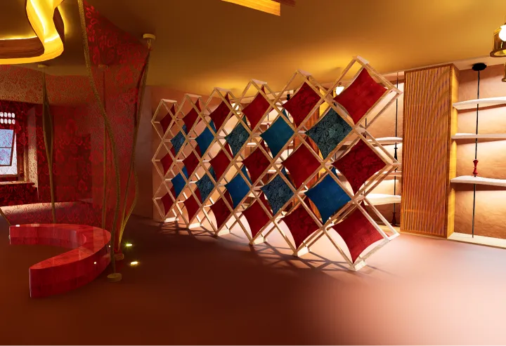 The studio uses reclaimed wood, recycled coconut shell panels, flexiply seating, and cane mesh partitions to embody a cradle-to-cradle philosophy. Surfaces and partitions are constructed using puppet-making waste, rattan cane, and urban plastic waste, converting potential discards into functional, beautiful elements. Textiles of varying transparencies and recycled fabrics reflect the play of light and shadow, echoing the dramatic essence of the puppetry art form.