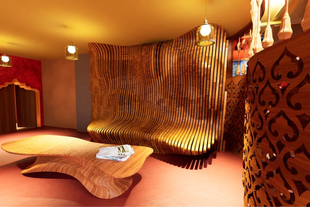 Proposed vision of implementing new and revolutionary methods of learning does not limit the learning within the 4 walls,An open planning approach dissolves traditional partitions, merging indoor spaces with the surrounding landscape, facilitating open-air workshops.The design strategy used for the hotspot is open , welcoming , comfortable yet strategically regulating.The central atrium features a stepped profile wing, providing visual connectivity throughout the space. An elemental staircase made of salvaged steel from ship breaking yard with sashay red paint from nippon as a symbol of strong stand,dynamism and a highlight serves as an informal hub of student activity, offering views of a central screen that works as thought activators similar to 3d murals on walls. Clear signage ensures easy navigation, with each space externally distinguished by unique window designs to create engaging and dynamic facades.