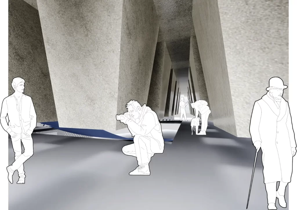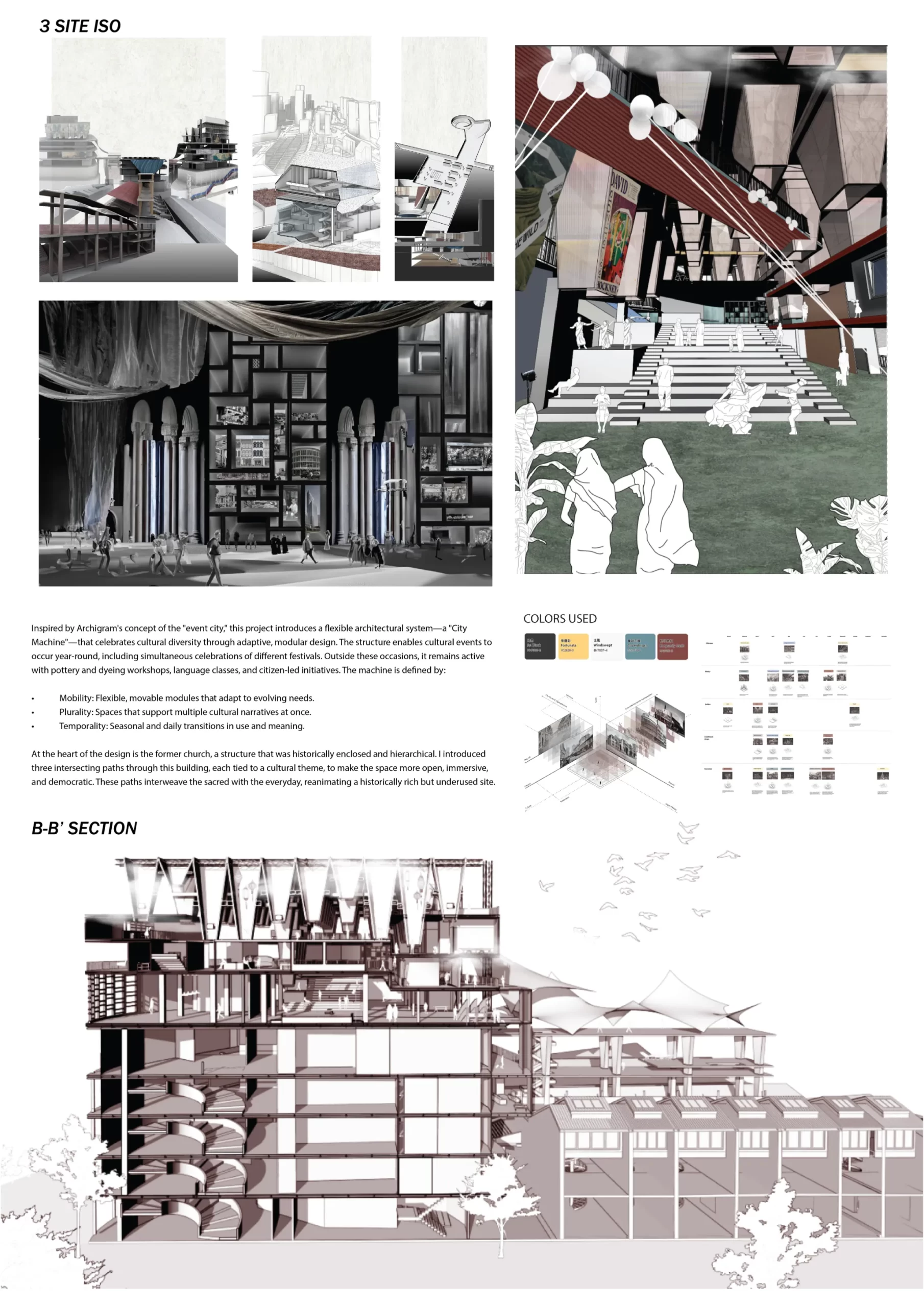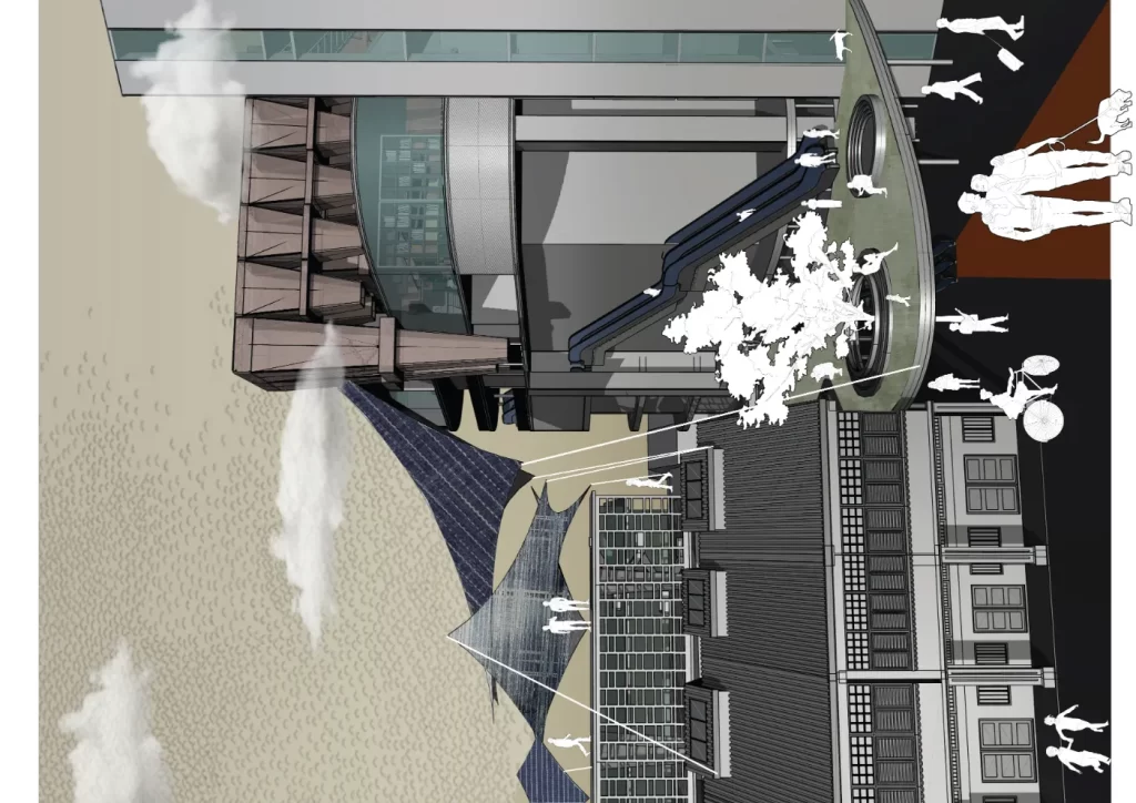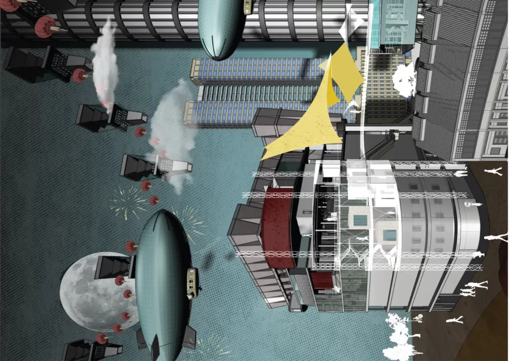 Drawing inspiration from Archigram’s “event city,” the proposal features an immersive architectural installation: a temporary but catalytic structure designed for performative, educational, and interactive use. This event machine is modular and reconfigurable—encouraging ongoing reinterpretation by its users. It brings together residents, workers, and visitors, fostering multicultural collaboration through shared experience and layered programming. Through sustainable materials and modular systems, the structure promotes environmental responsibility while supporting spontaneous human interaction.