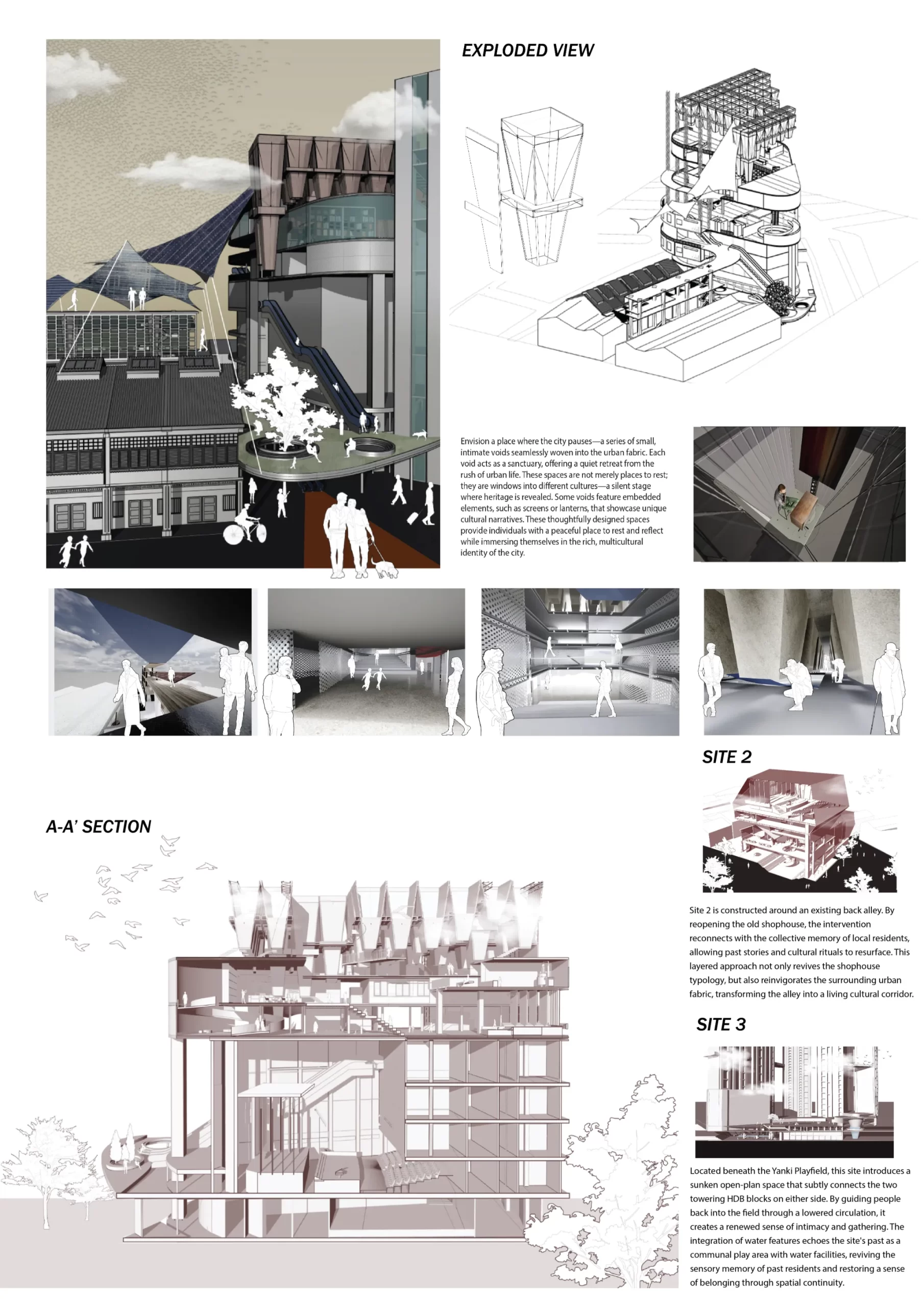 Italo Calvino once described cities as layered with invisible structures—complex networks shaped not just by architecture and infrastructure, but by stories, traditions, and lived experiences. In the context of Singapore, a city shaped by state-planned efficiency and global ambition, this project proposes a new typology—one that bridges macro-scale urban development with the nuanced, intimate lives of its people. As a foreigner observing this landscape, I saw not only skyscrapers and conserved facades, but the invisible rhythms of multicultural coexistence that too often remain unspoken in the built environment.
